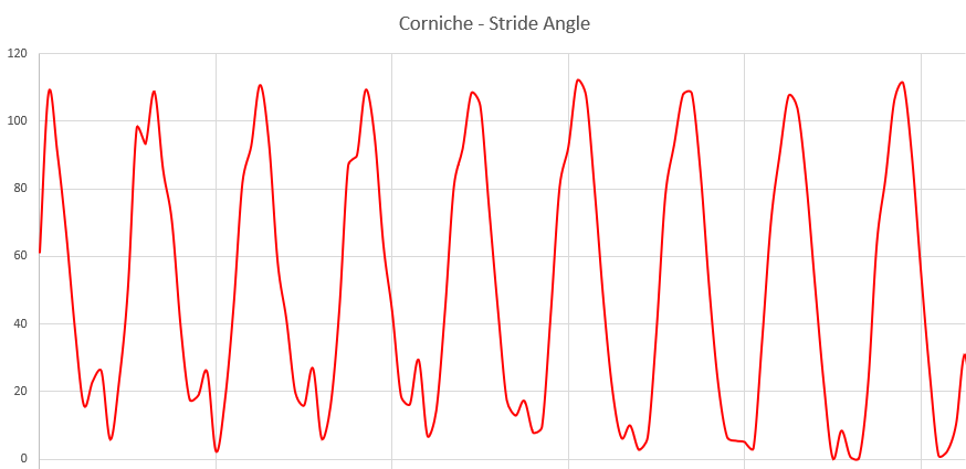 After some data processing and cleaning steps, we’re able to produce a graph of Corniche’s stride angle on his lead side.
